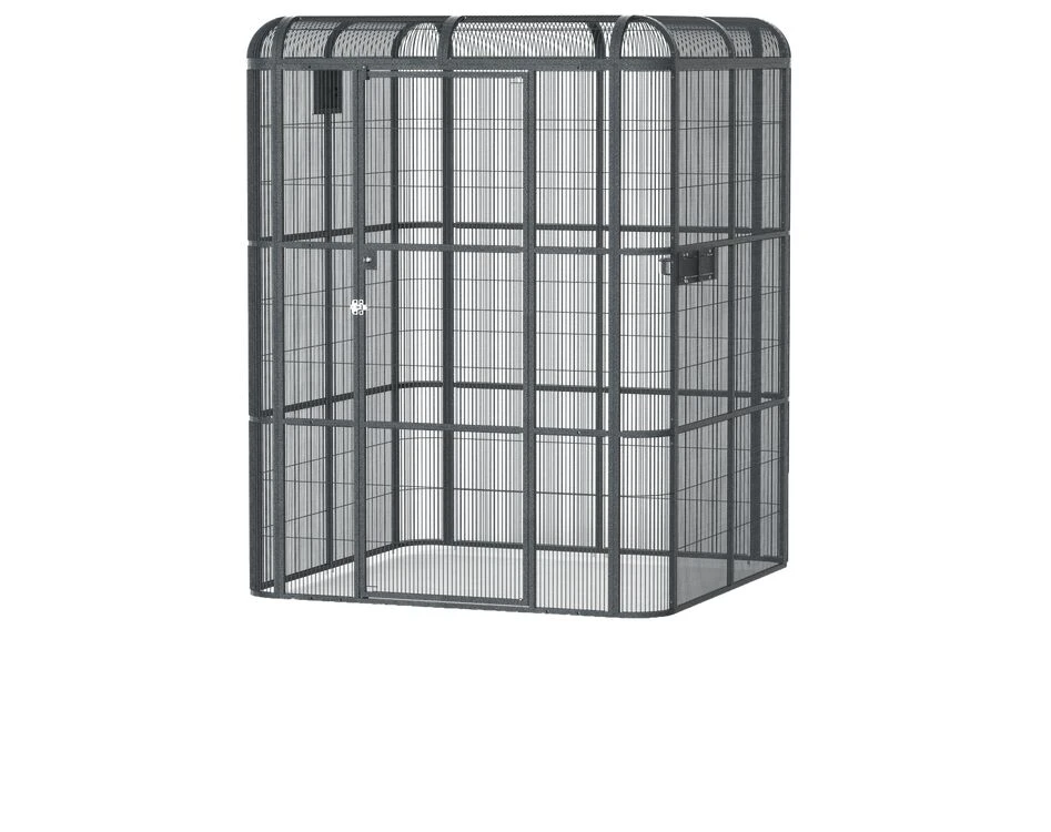 The Bird Aviary is a large walk in flight aviary for small birds such as Budgies & cockatiels and Medium Birds such as African Greys and Galahs. It features a large walkin lockable door with a key lock, and a built in 3 bowl swing feeder, as well as a small door for a nest box.Â