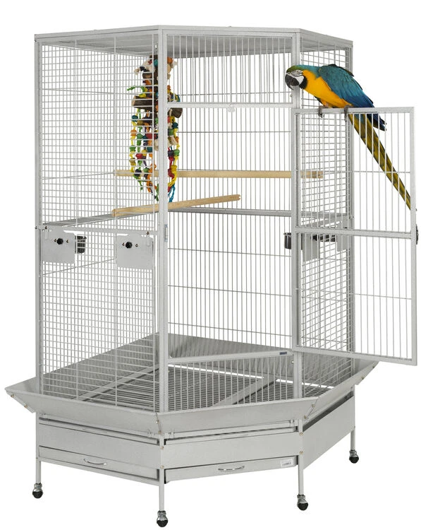The cage has been endorsed by the World Parrot Trust and features a unique corner design, with two internal perches and four stainless steel feeding bowls. A seed catcher and pull out cleaning tray will ensure that you have less mess, complete with a large opening front door.